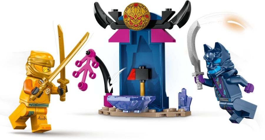 - 2 LEGO® NINJAGO® minifigura – Ez a nindzsás játékszett tartalmaz egy Arin minifigurát katana-kiegészítővel felszerelkezve, így a gyerekek eljátszhatják az összecsapásokat a Farkas álarcos harcossal, akinek kardja van